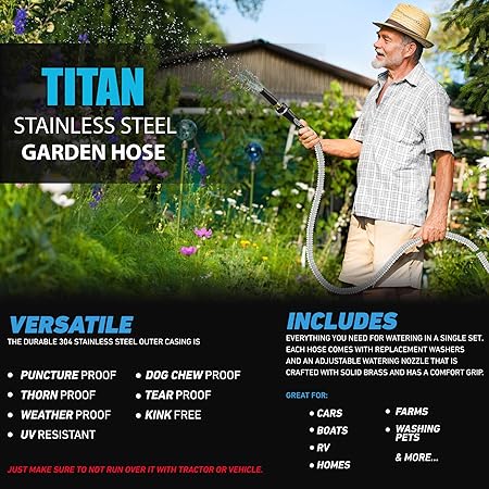 Amazon Com Titan 100ft Metal Garden Hose Flexible Water Hose With Solid 3 4 Brass Connectors 360 Degree Brass Jet Sprayer Nozzle Lightweight Kink Free Strong And Durable Heavy Duty 304 Stainless Steel Garden Outdoor from images-na.ssl-images-amazon.com Proprietary tpe properties provide the highestproprietary tpe properties provide the highest degree of puncture and abrasion resistance. Whereas many other garden hoses can be bulky and get easily tangled, the titan expandable garden hose is designed to be very compact. This premium garden hose by titan is designed to never tangle up. Craftsman premium garden hose at walmart. The titan expandable garden hose is a highly versatile tool to give you complete control over watering operations. It is lightweight and can expand to up to 75 ft. This steel garden hose is manufactured by titan. Regardless whether a lawn stretches across several acres or you have a small patio or backyard to deal with, a garden hose is an essential piece of equipment.